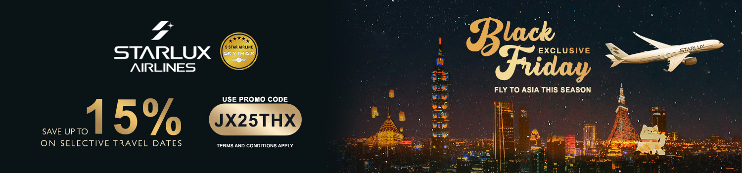 Our biggest Sale of the year is here! 5-star experience at exceptional value! As we give thanks for the journeys we've shared and as a way to express our gratitude to you, STARLUX Airlines is delighted to offer up to 15% off Premium Economy and Economy Class flights to Asia with a promo code JX25THX. Whether you're planning to reunite with family and friends, create new memories, this is the perfect time to book your journe you've been dreaming of.